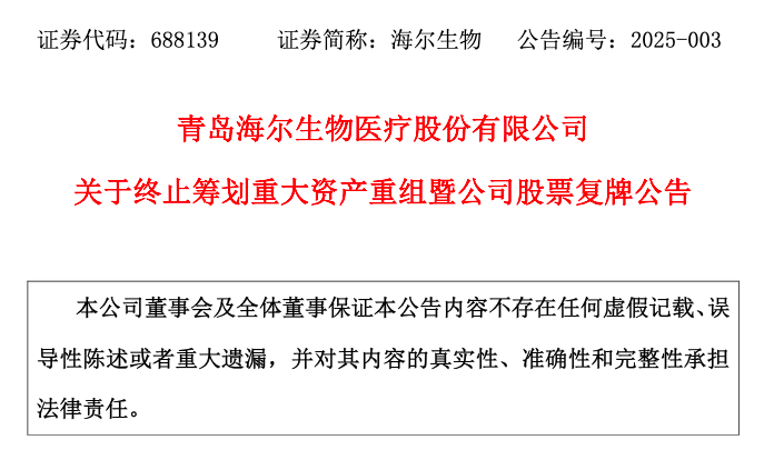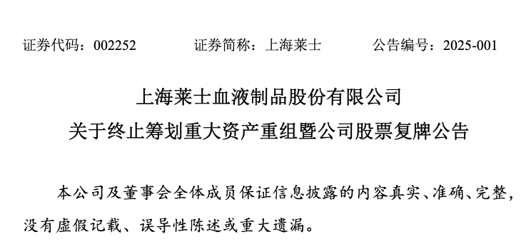 1月6日晚间,海尔生物(688139.SH)与上海莱士(002252.SZ)共同发布了一则关于终止重大资产重组及股票复牌的公告,标志着海尔生物原计划吸收合并上海莱士的资产重组计划正式告吹。