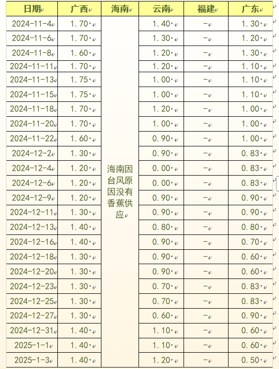 香蕉产地价格均价表(2024.11.4-2025.1.3)(单位:元/斤)