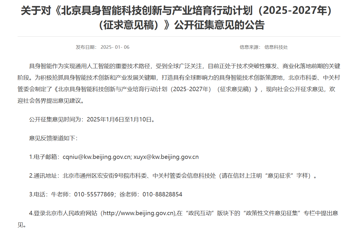 据北京市科学技术委员会、中关村科技园区管理委员会网站消息,北京市科委、中关村管委会已制定了《北京具身智能科技创新与产业培育行动计划(2025-2027年)(征求意见稿)》,并向社会公开征求意见,征集意见时间为1月6日至1月10日。