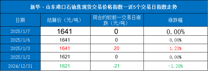 新华财经北京1月7日电(蒋正阳)据最新数据显示,截至2025年1月7日,新华·山东港口石油焦现货交易价格稳定于1641元/吨,与前一交易日价格保持一致,显示出市场供需平衡的稳定态势。