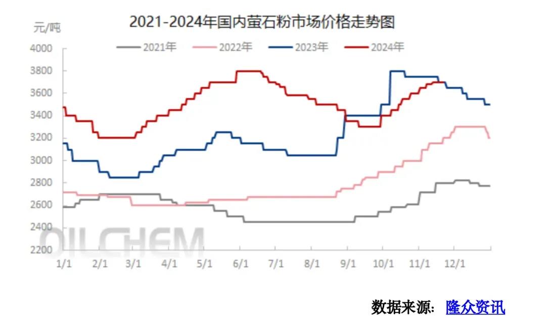 回顾2024年,制冷剂和萤石价格均表现出强劲的增长势头。制冷剂R32价格从年初的18000元/吨稳步上涨,最新价格已接近45000元/吨。同期,萤石粉价格也从年初的3400元/吨最高涨至接近4000元/吨。在此背景下,制冷剂市场的火热预期对上游萤石市场产生了积极影响。