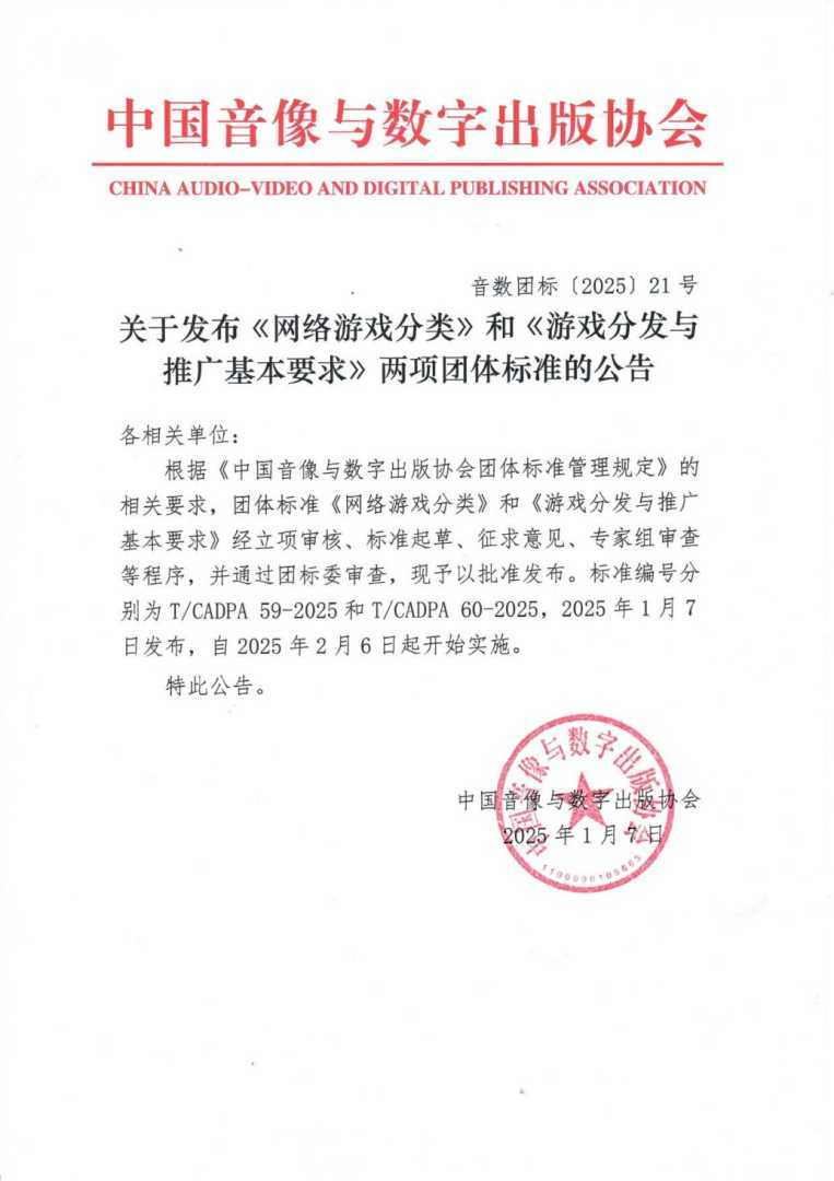 中国音像与数字出版协会正式批准发布《网络游戏分类》和《游戏分发与推广基本要求》两项团体标准,旨在推动游戏行业标准化、规范化发展,标准编号分别为T/CADPA 59-2025和T/CADPA 60-2025,自2025年2月6日起实施。