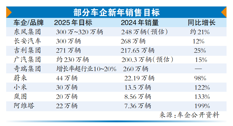 今年,“创新高”成为众多车企的年度目标关键词。广汽集团在新年贺词中提到,今年将全力挑战实现年度销量增长15%的经营目标;吉利汽车提出了2025年实现271万辆的全年销量目标,同比增长约24%……截至目前,已有近20家车企或品牌公布了2025年的全年销量新目标,关键词均为“创新高”。尤其是新势力车企的目标更为激进,如小米、阿维塔、岚图、深蓝汽车的年度目标普遍同比翻倍。例如,小米汽车2024年全年交付13.5万辆,而2025年的交付目标则大幅提升至30万辆,增幅达122%。