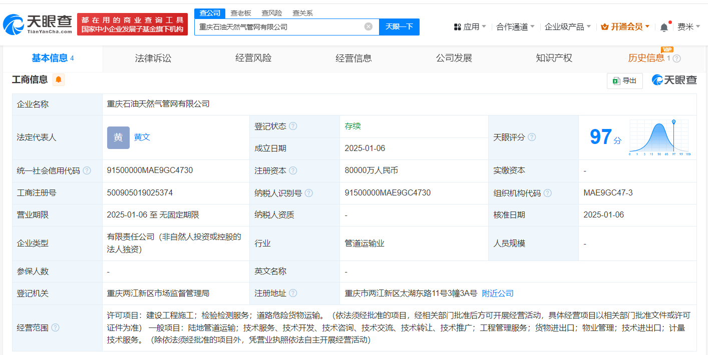 每经AI快讯,据天眼查App最新数据显示,近日,一家名为重庆石油天然气管网有限公司的新企业正式成立。该公司的法定代表人为黄文,注册资本高达8亿元人民币,显示出其雄厚的资金实力。其经营范围广泛,涵盖了建设工程施工、检验检测服务、道路危险货物运输、陆地管道运输、工程管理服务以及货物进出口等多个领域。值得注意的是,这家新成立的公司由国家管网集团西南管道有限责任公司全资持股,进一步彰显了其在能源管道运输领域的战略地位和重要性。