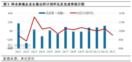 进入2025年1月份,尽管生猪出栏计划环比有所下降,但由于春节假期临近,实际有效出栏天数减少,预计日均生猪出栏量仍将环比增加。据卓创资讯监测数据显示,样本养殖企业2024年12月生猪出栏计划完成率高达105.97%,为2024年2月份以来的最高水平。这一超额完成率部分归因于部分生猪被提前至2024年12月出栏,导致2025年1月份样本企业生猪出栏计划环比下降9.65%。