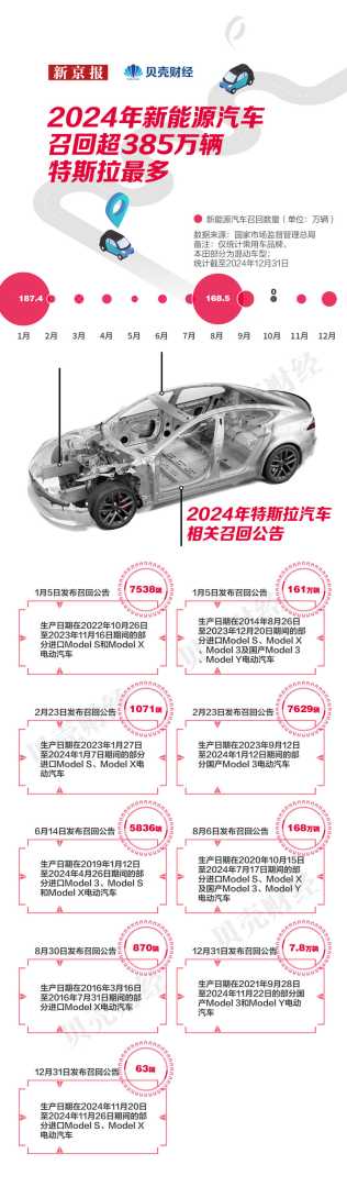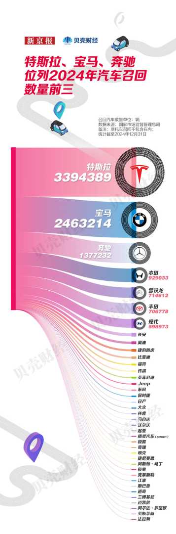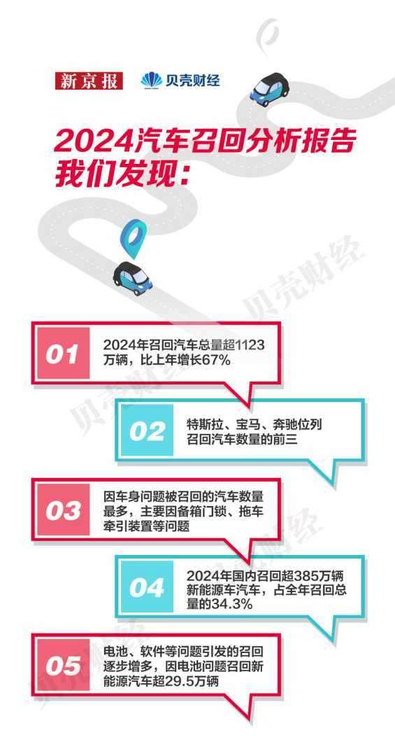 分析报告显示,2024年国内汽车召回数量创历史新高,达到约1123.7万辆,同比增长67%。特斯拉、宝马、奔驰位列召回数量的前三名。新能源汽车方面,召回数量超过385万辆,其中电池安全问题成为召回的主要原因之一。