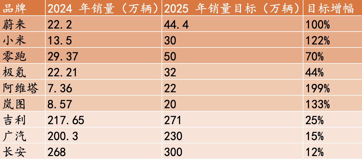 2025年车企销量目标曝光:新势力激进,传统车企稳健,价格战或难免
