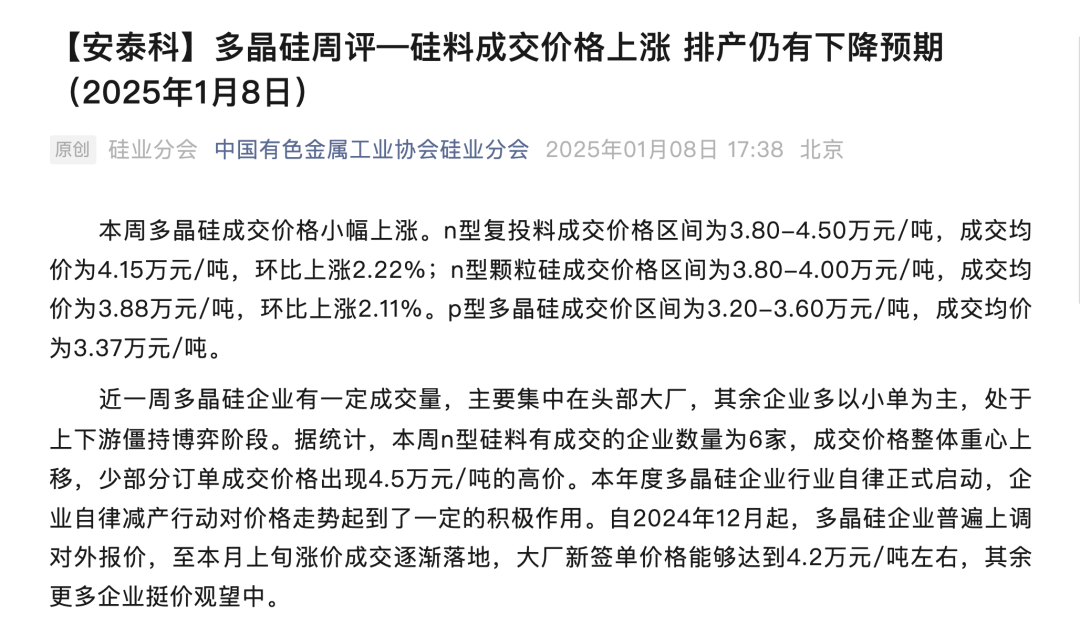 在通威股份、大全能源等光伏行业领军企业的减产控产决策后,1月8日,中国有色金属工业协会硅业分会发布的最新多晶硅周评显示,硅料成交价格出现上扬,同时排产量预期仍有下滑趋势。