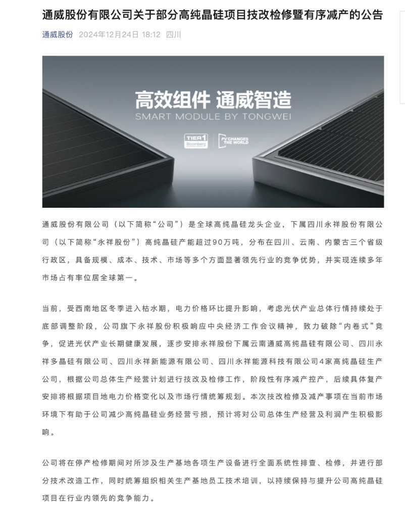 通威股份与大全能源分别在2024年12月24日晚间宣布,受多种因素影响,将有序减产控产。据披露,通威股份、大全能源、协鑫科技的多晶硅产能合计超过170万吨,截至2024年10月,国内已投产的多晶硅产能约为260万吨。