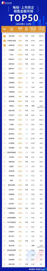 在2024年的最后一个月,房企排名变动尤为剧烈,50家上市房企中有近六成(29家)的排名发生了变化。然而,随着新政的持续发力,12月的销售市场有所回暖,TOP50房企单月销售额达到3560亿元,成为去年内的第三高峰。