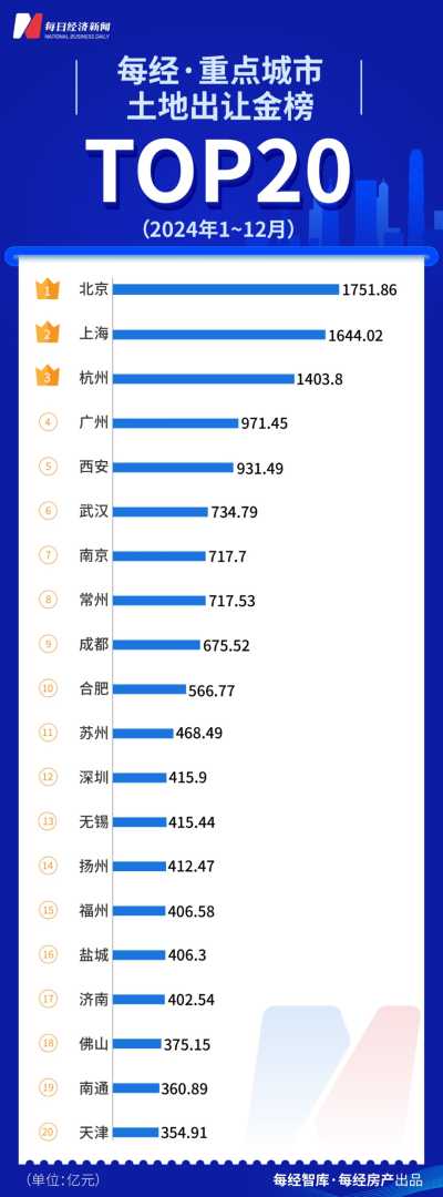 在土地出让金方面,北京和上海两大一线城市领跑全国。2024年全年,北京的土地出让金总额高达1752亿元,上海紧随其后,达到1644亿元,杭州则以1404亿元位列第三。其余城市的土地出让金均未超过千亿元。在TOP20城市中,广州、西安、武汉、南京、常州、成都、合肥等地的土地出让金均超过500亿元。