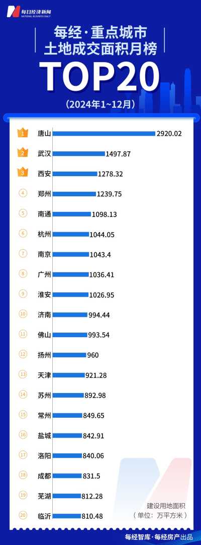在土地出让面积方面,唐山市以2920万平方米的出让面积遥遥领先,比第二名武汉高出近1500万平方米。在TOP20城市中,共有9个城市的土地出让面积超过1000万平方米。