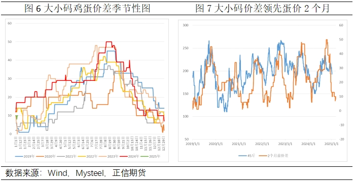 统计数据显示,大小码价差呈现出明显的季节性特征,上半年强于下半年,7月至8月见顶后9月开始下行。这反映了鸡龄结构的变化和蛋鸡苗采购的季节性波动。基于这一逻辑,我们将大小码价差与蛋价进行对比分析,发现两者之间存在一定的正相关性。进入2024年以来,供给端养殖情绪对市场的影响进一步加强,按大小码价差推演,蛋价在3月前将继续承压。同时,从季节性规律来看,12月至次年2月是蛋价的下跌阶段,因此可进行空头策略布局。