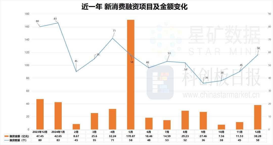 财联社创投通数据显示,2024年12月,国内消费相关领域披露融资事件58起,同比下降27.5%,但环比上升28.9%;累计融资额达到38.28亿元,同比下降19.6%,环比增幅高达232%。这表明年关将至,一级市场活跃度明显提升,获投项目增多,融资金额更是翻倍。