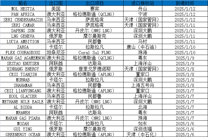 中国天然气信息终端(E-Gas系统)发布的实时数据显示,1月6日至1月12日当周,中国LNG进口量显著增加,澳大利亚为主要供应国。同时,E-Gas系统为市场参与者提供了详细的进口预测和数据分析。