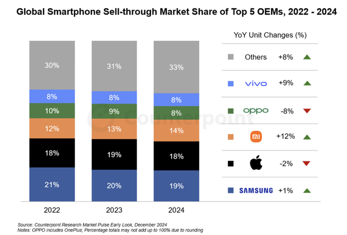 小米在五大品牌中增长最快,全球市场份额达到14%,这得益于其产品组合的调整、高端品牌的推动以及积极的扩张策略。OPPO排名第四,尽管份额有所下降,但在去年结束时势头更为强劲。vivo凭借在印度和中国的出色表现,成功跻身前五名。