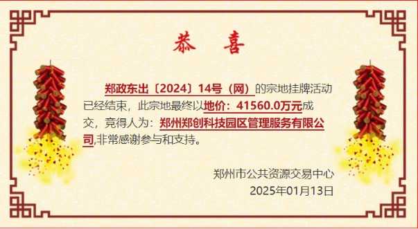 【大河财立方消息】2024年1月13日,郑州郑创科技园区管理服务有限公司在土地拍卖中以底价4.156亿元成功竞得郑政东出〔2024〕14号(网)地块,标志着该地区新型产业及商业发展的又一重要里程碑。