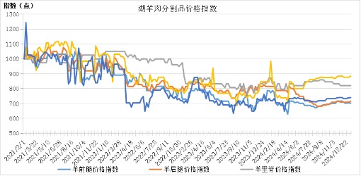 湖羊肉分割品价格指数方面,截至1月5日,与上期相比,各分割品中羊后腿和羊肋排的价格上涨。具体来看,羊后腿价格指数报715.94点,较上期上涨0.93%,价格为54.5元/公斤,较上期上涨0.5元/公斤;羊肋排价格指数报884.84点,较上期上涨0.88%,价格为57.5元/公斤,较上期上涨0.5元/公斤。其他如羊前腿、羊里脊和羊肉卷的价格则保持平稳。