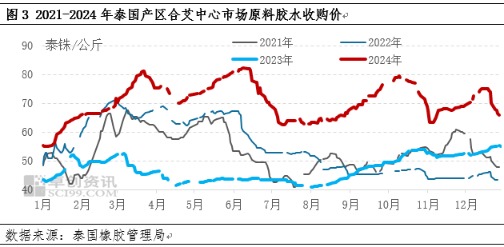 从基本面来看,2024年新胶供应不畅,供应端利多成为推动胶价上涨的关键因素。特别是11月下旬以来,泰国南部主产区连续降雨,导致割胶作业受阻,市场对供应异常的担忧加剧,支撑胶价保持高位。同时,原料胶水价格维持高位,对胶价底部形成支撑。
