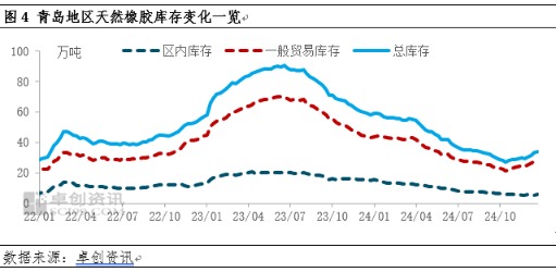 从国内市场来看,2024年四季度,随着船货陆续到港及国储胶入库,青岛地区天然橡胶库存累库节奏加快,胶价缺乏上行支撑。据统计,12月27日当周,青岛地区天然橡胶样本仓库库存较11月底增加4.32万吨,增幅14.69%。