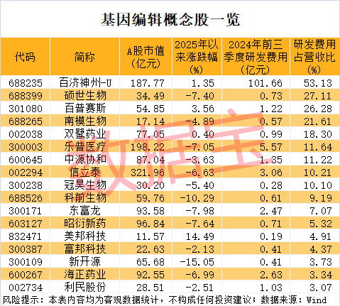 从二级市场表现来看,据证券时报·数据宝统计,截至1月13日收盘,基因编辑概念股今年以来平均下跌3.99%,其中4股逆市上涨,分别是美邦科技、百普赛斯、百济神州-U、双鹭药业。从研发强度来看,2024年前三季度,基因编辑概念股中,研发费用占营收比例超10%的有9只,占比过半数。其中,百济神州-U、硕世生物、百普赛斯、南模生物、双鹭药业研发费用占营收比例排在前五位。