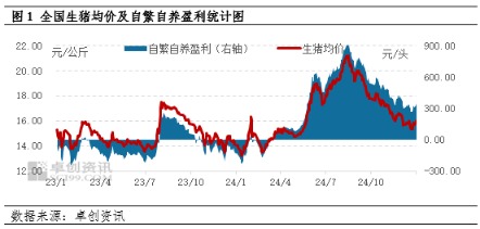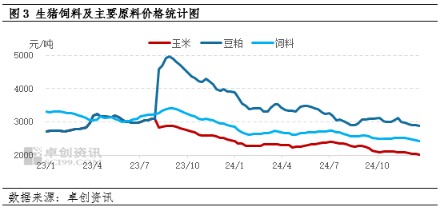 饲料作为生猪养殖的主要成本支出,其价格变化直接影响到生猪养殖成本,进而带动养殖盈利的变化。卓创资讯监测数据显示,2023年9月份以来,生猪饲料原料价格呈现下降趋势,2024年仍以降为主。由2024年初的2838.94元/吨降至年末的2427.74元/吨,累计降幅达14.48%。这奠定了整体养殖成本下降的基础,据卓创资讯推算,以125公斤标猪出栏体重计算,2024年生猪养殖成本较2023年同期下降约1.10元/公斤,从而助推了生猪养殖盈利的提升。
