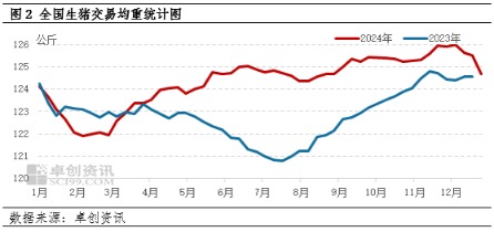 除了生猪价格直接影响生猪养殖盈利提升外,生猪交易均重的上涨也对单头生猪养殖盈利产生了积极影响。2024年生猪供应偏紧,养殖端看涨预期持续存在,压栏惜售现象增加。据卓创资讯监测,全国生猪交易均重由春节假期后的121.92公斤最高增至12月初的125.99公斤,全年均值为124.36公斤,同比涨幅1.24%。在体重提升的影响下,生猪养殖盈利进一步扩大。