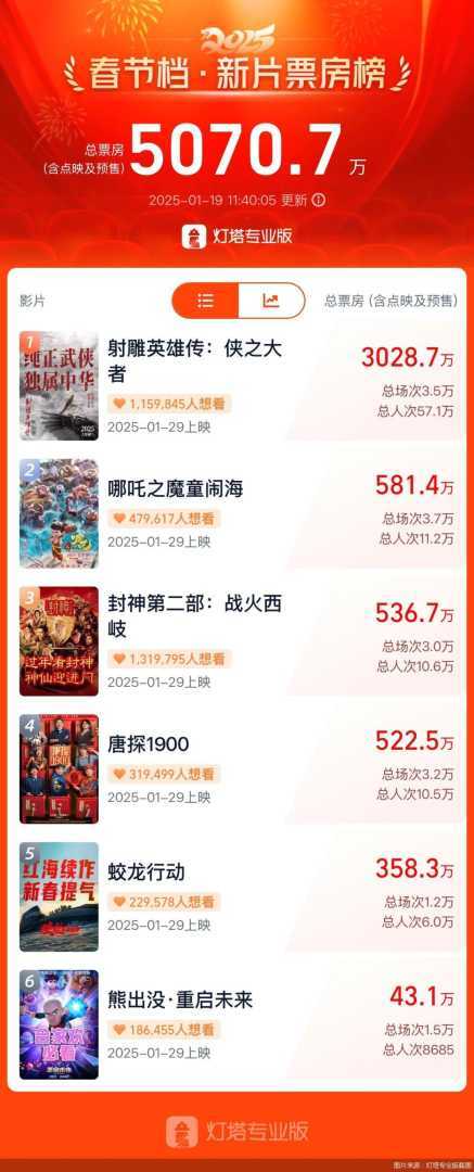 2025年1月19日,电影市场迎来了一个激动人心的时刻,据灯塔专业版数据显示,备受瞩目的2025年春节档电影预售正式拉开帷幕。截至当日上午11时40分,春节档预售总票房已迅速攀升至5070.7万元,这一数字不仅彰显了观众对于新春电影盛宴的热切期待,也预示着今年春节档将是一场票房与口碑的双重较量。