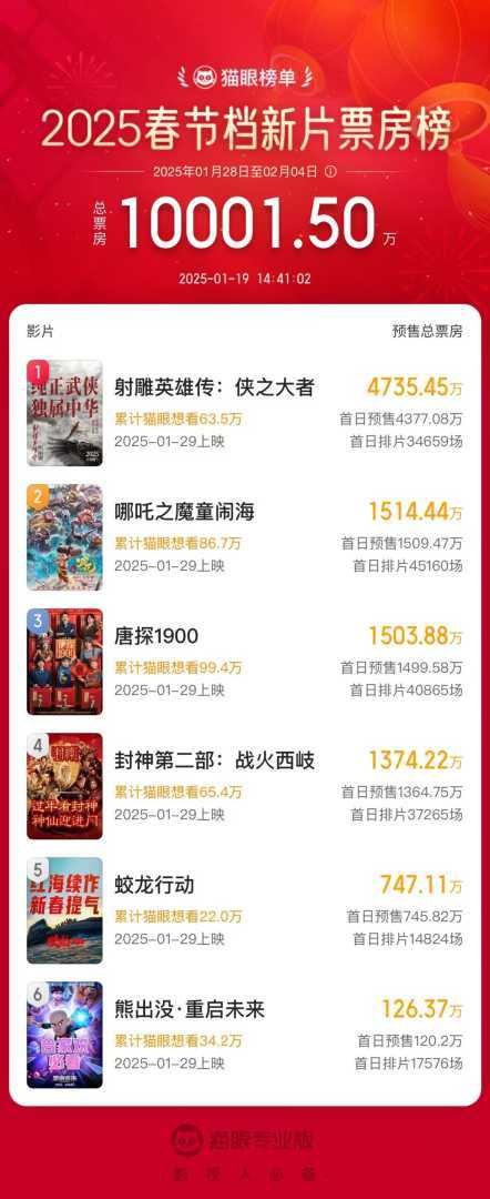 2025年春节档电影预售火爆,刷新预售最快破亿纪录