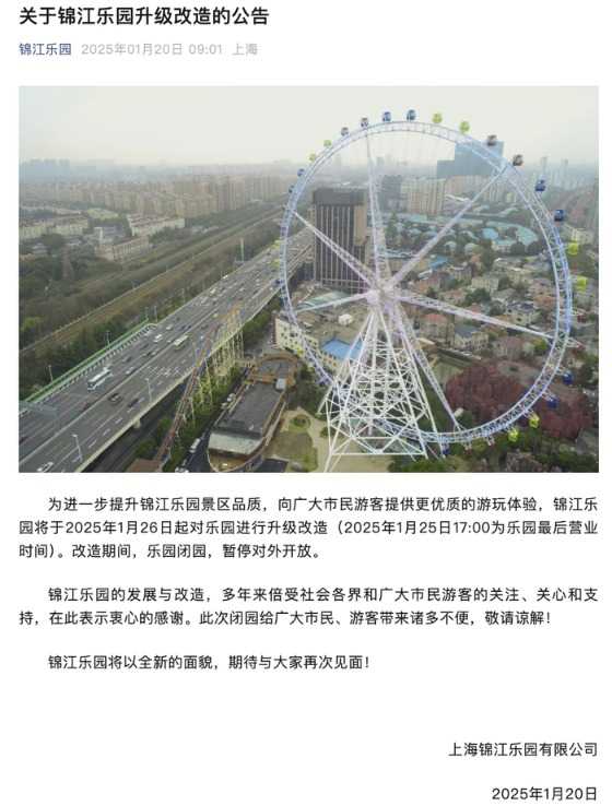 2025年1月20日,锦江国际集团旗下的上海锦江乐园正式发布公告,揭晓了一项重要决定:自2025年1月26日起,乐园将启动全面的升级改造工程。此次改造旨在进一步提升游客体验,丰富娱乐项目,优化园区设施。值得注意的是,乐园的最后营业时间定于2025年1月25日的17:00,此后乐园将进入闭园状态,暂停对外开放,直至改造完成。