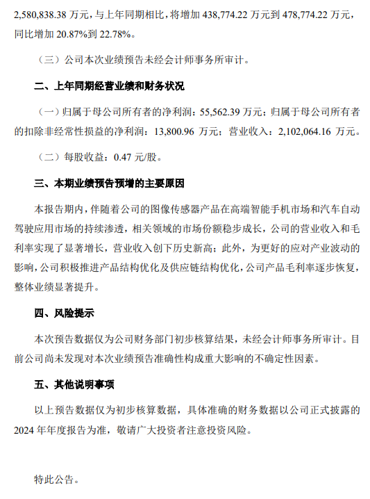 韦尔股份公告预计2024年净利润将大幅增长467.88%至503.88%,主要得益于图像传感器产品在高端智能手机和汽车自动驾驶市场的持续渗透。