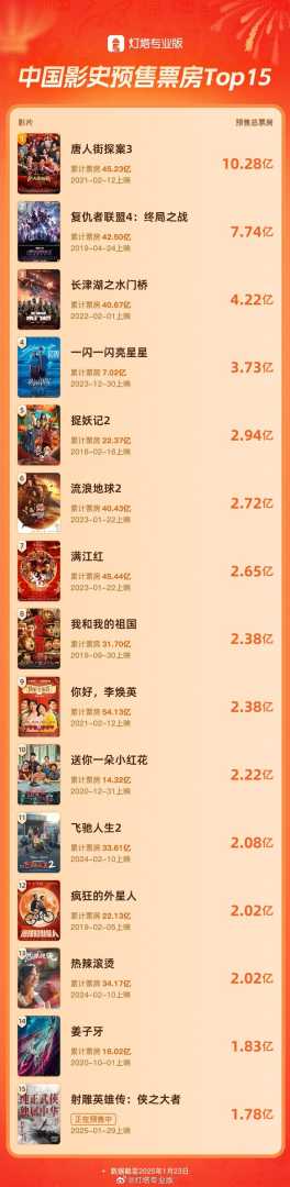 根据灯塔专业版最新数据显示,截至2025年1月23日12时27分,备受瞩目的影片《射雕英雄传:侠之大者》预售总票房已强势突破1.78亿元人民币大关,这一成绩不仅超越了经典好莱坞大片《复仇者联盟3:无限战争》的预售成绩,更是成功跻身中国影史预售票房榜前15名,彰显出该片强大的市场号召力和观众期待值。
