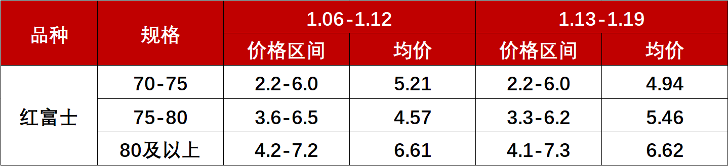 根据指数监测,截至1月20日,70-75规格富士苹果均价报4.94元/斤,环比下跌0.27元/斤,跌幅5.15%;75-80规格富士苹果均价报5.46元/斤,环比上涨0.89元/斤,涨幅19.49%;80及以上规格富士苹果均价报6.62元/斤,环比上涨0.01元/斤,涨幅0.05%。此外,少数企业75-80规格精品果销售价格高达6.50元/斤,80及以上规格精品果销售价格更是可达8.50元/斤。
