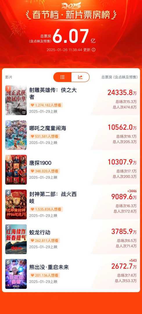 据权威网络平台数据统计,截至2025年1月26日11时33分,2025年春节档(1月28日至2月4日)档期总预售票房已强势突破6亿大关,这一成绩不仅彰显了观众对于新春电影市场的热烈期待,更刷新了中国影史春节档预售最快破6亿的全新纪录。