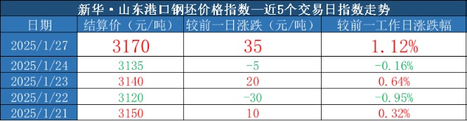 新华财经北京1月27日电(陆子琛)最新市场数据显示,截至1月27日,新华·山东港口钢坯价格显著上扬,报价达到3170元/吨,与前一交易日相比,价格上涨35元/吨,涨幅达到1.12%。这一动态反映了钢材市场近期的积极趋势。