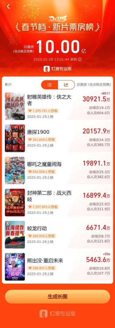 截至2025年1月28日13时01分,2025年春节档新片预售总票房已突破10亿元,其中《射雕英雄传:侠之大者》和《唐探1900》表现尤为亮眼,有望推动档期票房再创新高。