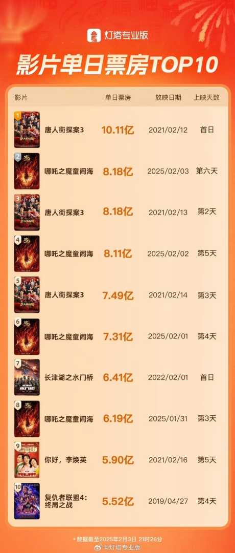 《哪吒之魔童闹海》2月3日单日票房超8.18亿,进入中国影史单日票房榜前二,持续刷新影史动画片单日票房新高,彰显国产动画电影市场号召力。