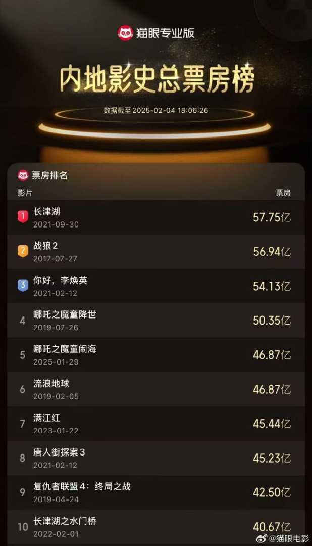 《哪吒之魔童闹海》票房破46.87亿,跻身中国影史票房榜前五