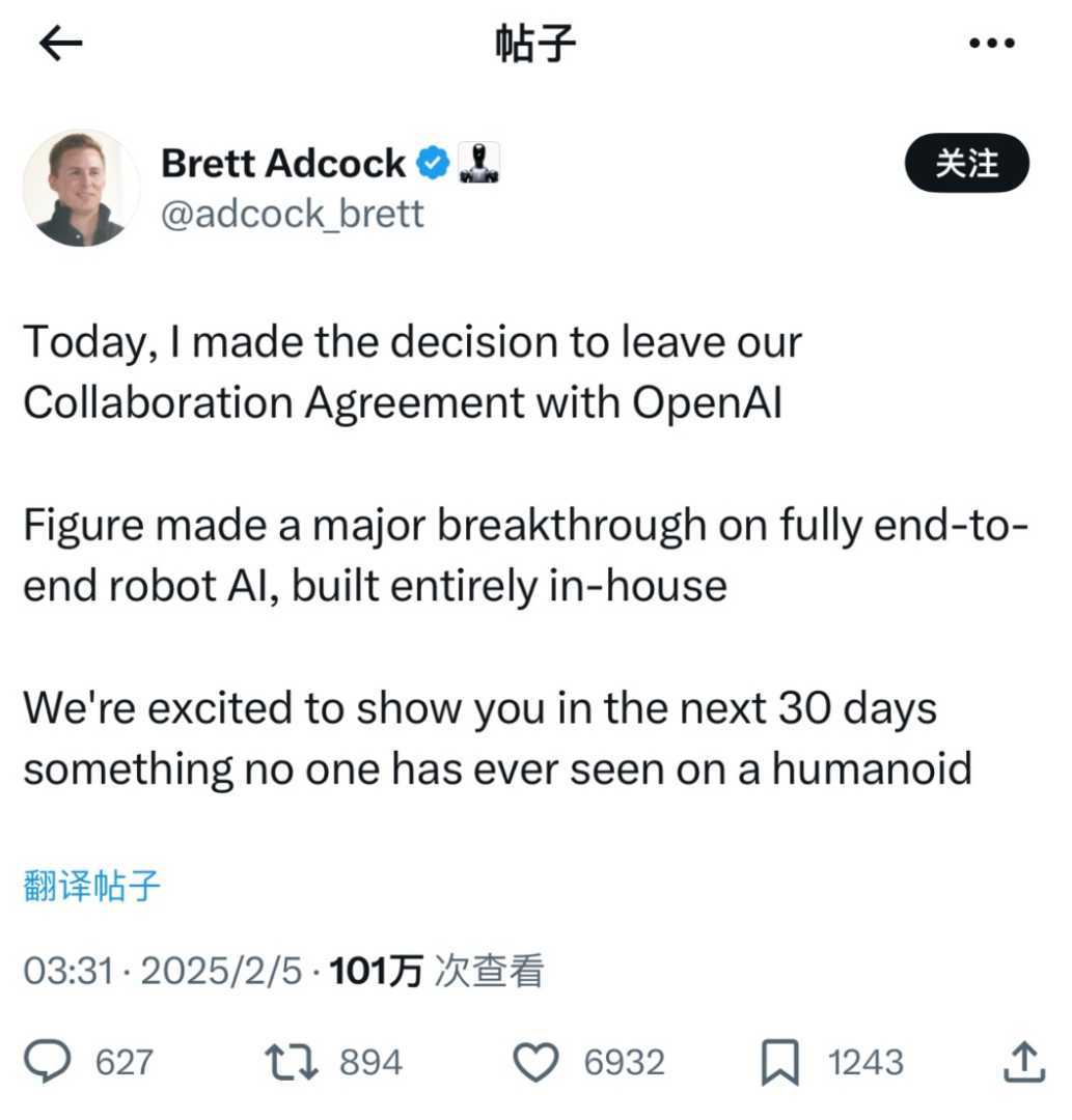 美东时间2025年2月4日,机器人领域的知名企业Figure的创始人兼首席执行官Brett Adcock,在社交媒体平台X上正式宣布,Figure将终止与人工智能巨头OpenAI的合作关系。