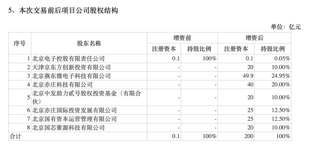 具体投资分配方面,燕东科技慷慨出资49.9亿元,天津京东方创投投资20亿元,亦庄科技、亦庄国投、北京国管分别投资40亿元、25亿元、25亿元,中发贰号基金和国芯聚源则各投资20亿元。此番增资后,燕东科技以24.95%的持股比例跃居第一大股东,并计划通过签署一致行动协议与天津京东方创投、亦庄国投及北京国管共同实际控制北电集成。