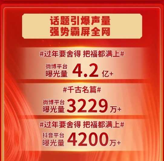 此外,“2025舍得春节及央视栏目新媒体社会化传播项目”的总曝光量也超过了5.1亿,总互动量达到了298万次以上;抖音云图拉新人群规模更是高达2236万次以上。其中,话题#过年要舍得把福都满上#在微博平台的曝光量就超过了4.2亿次。