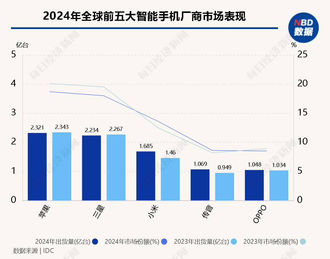 国产手机厂商全球出货量创新高,高端市场挑战苹果三星