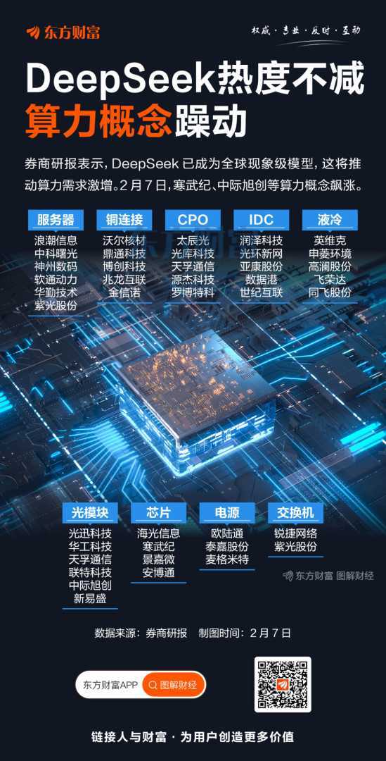 中国AI创新力量崛起,Deepseek的迅速走红不仅点燃了市场热情,更引发了对于算力需求的空前关注,推动算力概念板块强势上行。2025年2月7日,A股市场算力概念板块内,中软通动力等多股强势涨停,同时,寒武纪、中际旭创等市值超千亿的行业巨头亦大幅攀升,彰显出市场对于算力未来的强烈信心。
