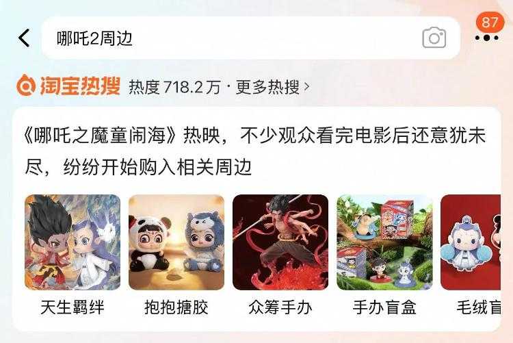 这部影片的成功不仅体现在票房上,其衍生品的销售也同样火爆。许多观众在观影后仍沉浸在哪吒的世界里,纷纷开始购买与电影相关的周边产品。这一趋势在某电商平台上得到了明显体现,搜索“哪吒周边”等关键词,该电影的周边产品迅速登上热搜首位,热度值超过700万。同时,官方番外绘本《哪吒三界往事》的热度也紧随其后,本周热度上升了129%,接近500万。