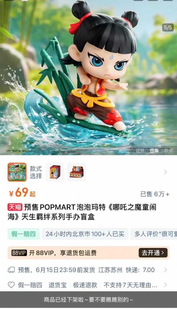 在“泡泡玛特抽盒机”小程序上,同样显示相关产品已售罄,并提示预计6月15日发货。这一消息无疑进一步加剧了消费者对哪吒周边产品的期待和追捧。