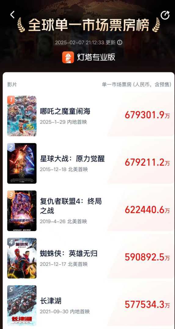 《哪吒2》成为全球影史单一市场票房榜冠军图片来源:灯塔专业版