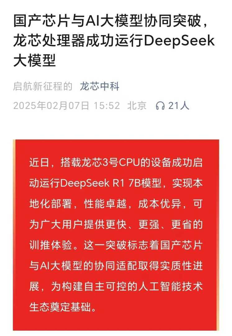 龙芯中科成功运行DeepSeek R1 7B模型,国产AI芯片适配进展显著