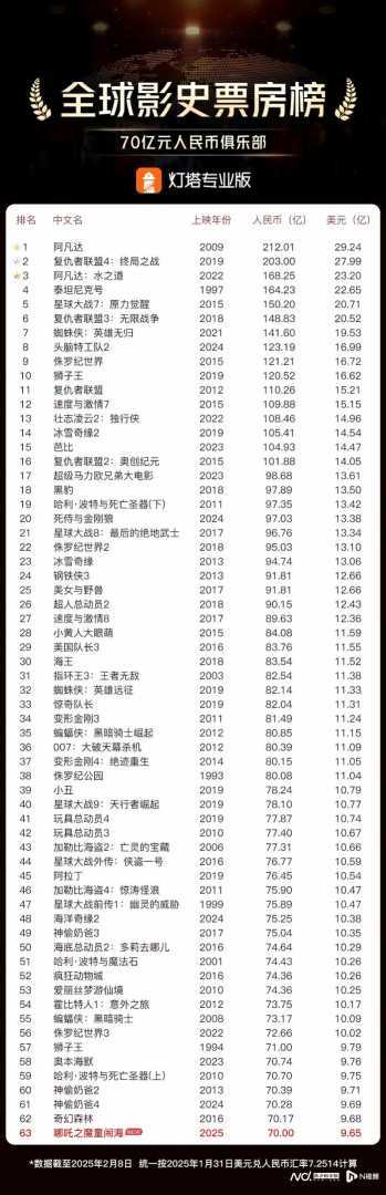 在由《阿凡达》《复仇者联盟》《速度与激情》等好莱坞大片构成的“全球票房70亿俱乐部”中,《哪吒之魔童闹海》的异军突起,标志着中国电影不仅在本土市场拓展上取得了显著成就,更在国际市场竞争中迈出了坚实的一步。借助春节档的余温及观众持续的观影热情,该片在全球票房70亿俱乐部的排名有望进一步攀升,无论最终定格在哪个位置,都是对国产电影的一次巨大肯定。
