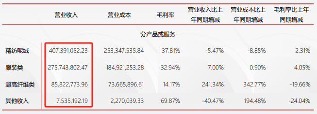 业绩方面,南山智尚上市前的2019年营收17.71亿,上市当年的2020年营收为13.58亿,到2023年为16亿。从业务构成来看,2024年上半年,精纺呢绒、服装类收入占比分别为52.98%和35.86%,合计贡献了88.84%的收入,新业务的发展未能有效改变公司的业务结构,也未能带来预期的业绩增长。