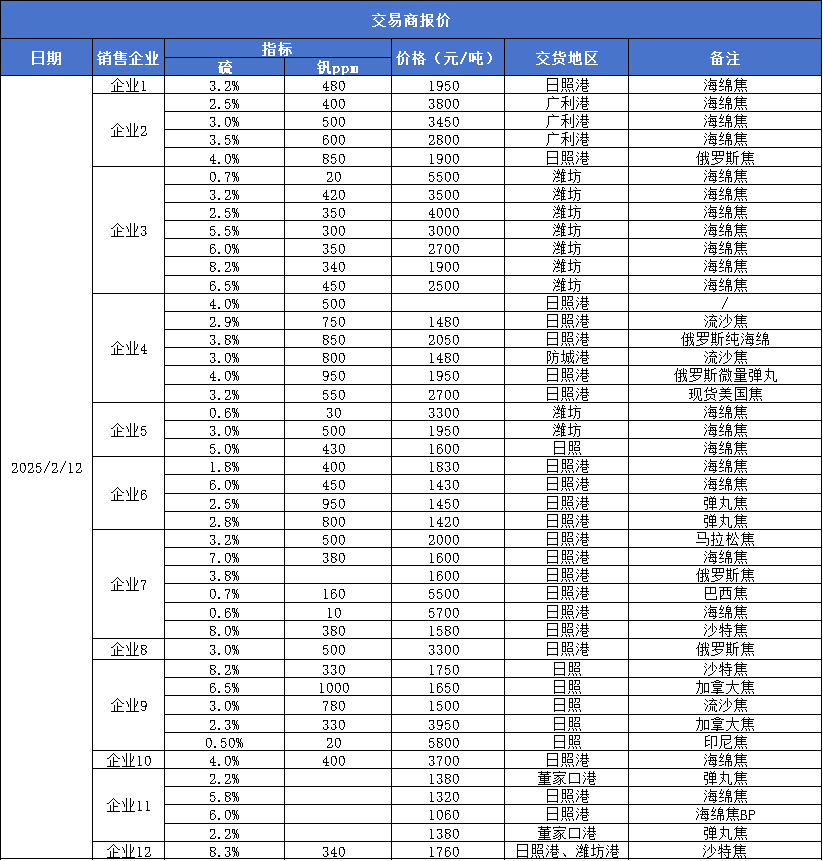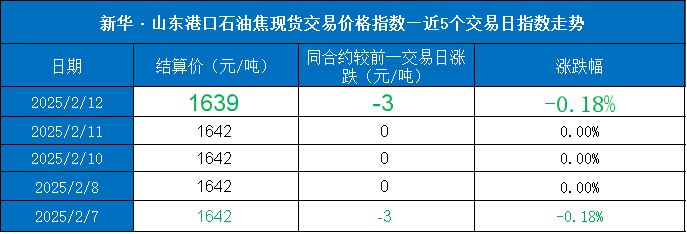 新华财经北京2月12日电(蒋正阳) 截至2025年2月12日,新华·山东港口石油焦现货交易价格报1639元/吨,较前一交易日下跌3元/吨,跌幅0.18%。
